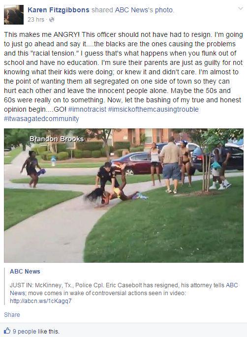 A recent Facebook posting by a fourth grade teacher in Texas or maybe I should say former teacher of Friendship Independent School District has set off a firestorm. Karen Fitzbiggons has said more than a mouthful in response to yet another example of police misconduct. This time it was in McKinney, Texas at a pool party. Now, I’ve heard it said that everything is bigger in Texas but in this case, her words should not have been said at all.